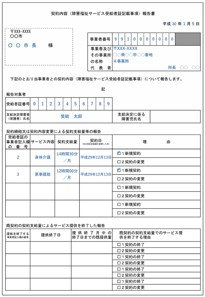 利用者と契約を行ったら、「契約内容(障害福祉サービス受給者証記載事項)報告書」を市町村等に提出します。