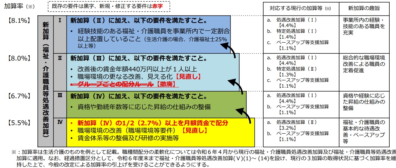この処遇改善加算は、以前は「処遇改善加算」「特定処遇改善加算」「ベースアップ等支援加算」と3つに分かれていましたが、令和6年度改正により、「処遇改善加算」に一本化され、加算率が引き上げられました。